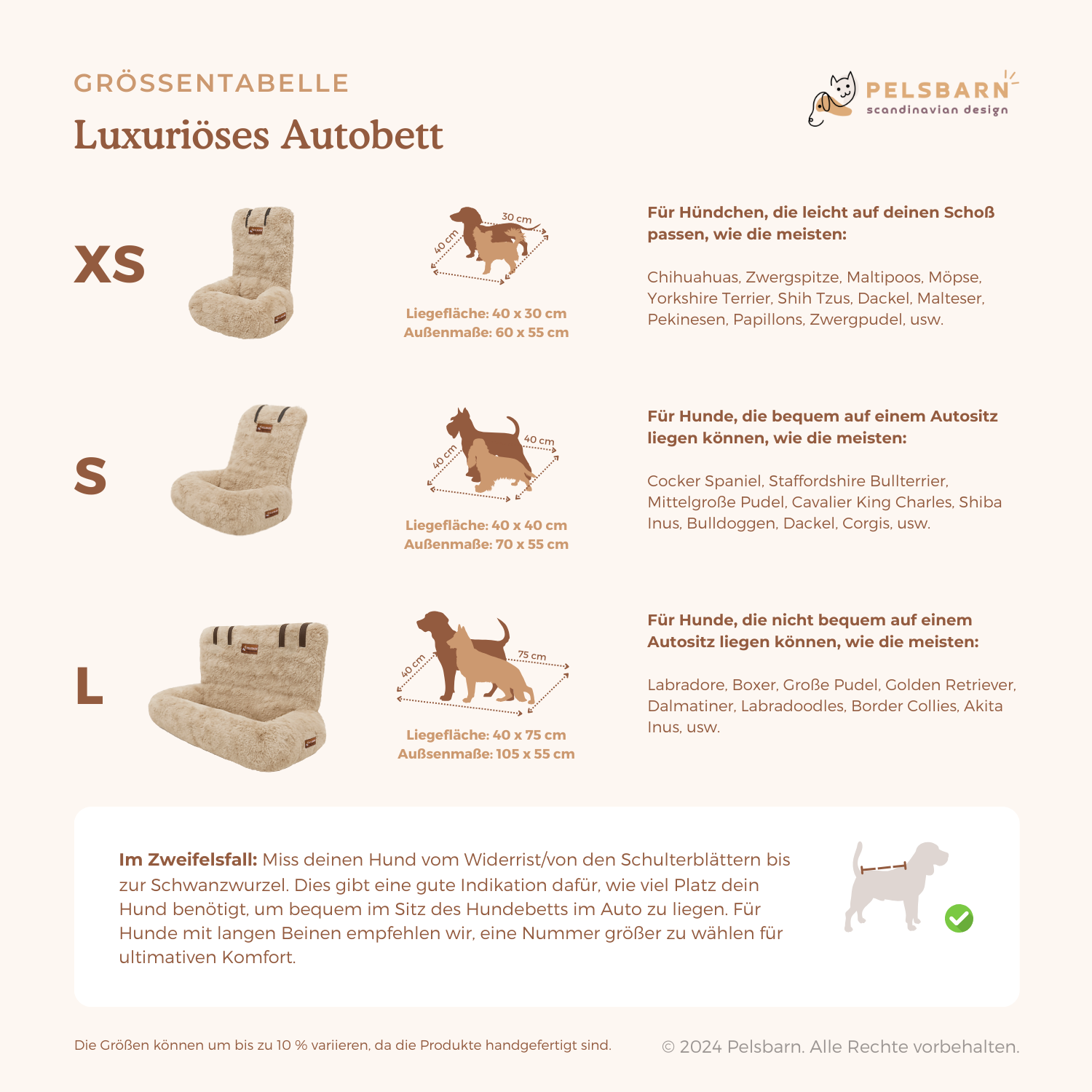 Wenn du dir über die Größe des Autositzes unsicher bist, schau dir bitte unsere Größentabelle unten an. Wenn du zwischen den Größen liegst, entscheide dich für die größere Größe für mehr Komfort für deinen Hund!
