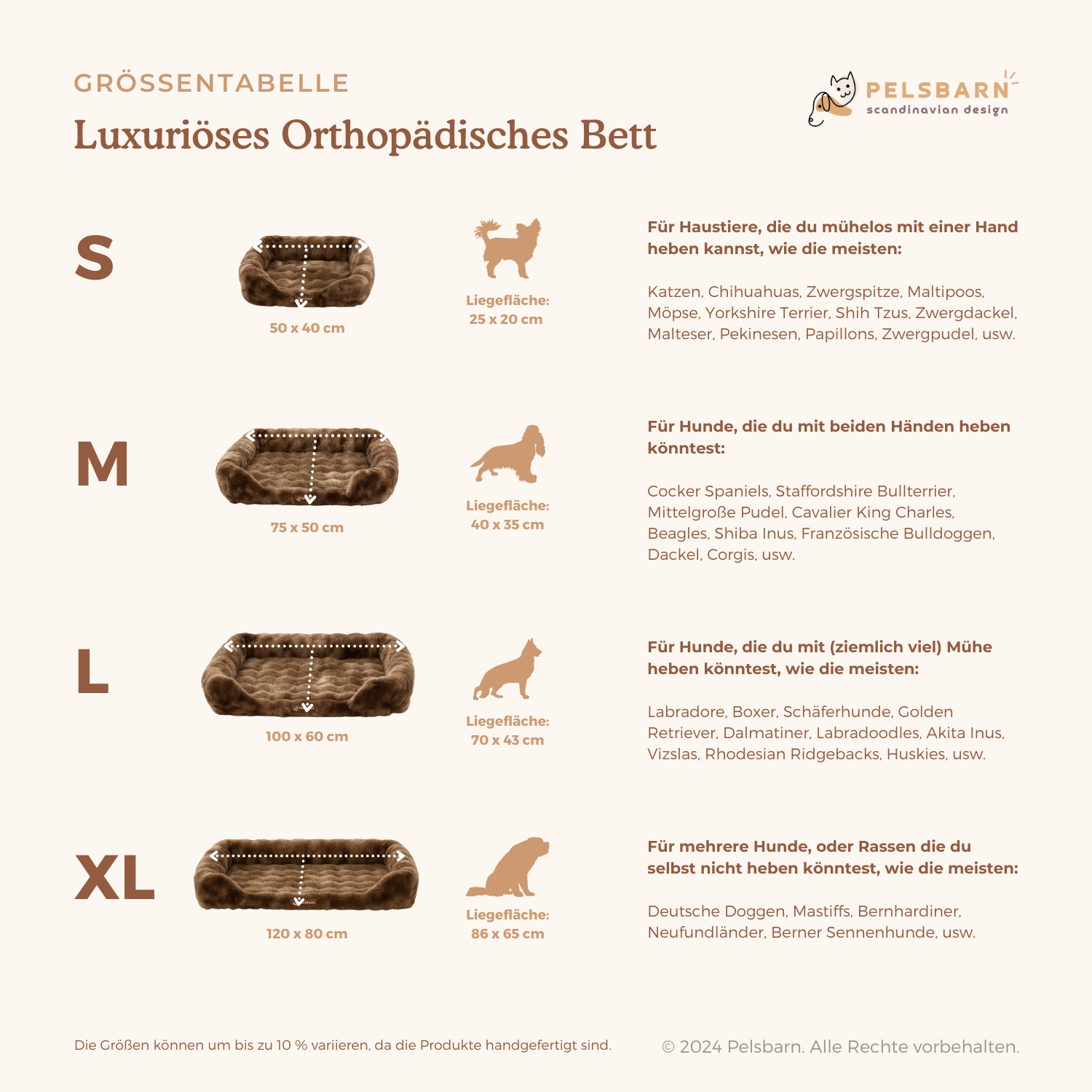 Wenn du dir über die Größe des orthopädischen Bettes unsicher bist, sieh dir bitte unsere Größentabelle unten an. Wenn du zwischen den Größen schwankst, entscheide dich für die größere Größe für mehr Komfort für deinen Hund!